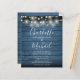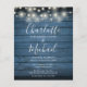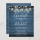 A stylish rustic budget wedding invitation featuring pretty string lights, signature style names and chic typography on a blue rustic wood background. Designed by Thisisnotme©