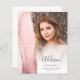 This trendy 2025 graduation announcement features a watercolor agate geode border in shades of blush pink with faux gold glitter highlights. The graduate's first name appears as an elegant charcoal gray handwriting script overlay on a vertical photo, along with the last name, school and class year in copperplate font. A white gradient filter helps the text pop. A second, horizontal photo appears on the back, along with the announcement and details in charcoal gray text on a white background.
