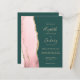 The left-hand edge of this elegant modern wedding invitation features a blush pink watercolor agate border trimmed with faux gold glitter. The customizable text combines pale gold-colored handwriting, copperplate and italic fonts on an emerald green background. Add additional details on the back, along with a QR code to help your guests visit your wedding website.