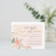 Modern bridal luncheon bridal shower invitation featuring faux gold foil script against a blush pink overlay with beautiful watercolor peonies and roses in shades of peach and cream in one corner. Your details are displayed with a simple, stylish typography. As part of the budget selection here on Zazzle, these invitations do not come with envelopes nor do they fit snugly in a standard-sized envelope. The closest size is A6 but there will be a gap of approximately half an inch. If you don't mind the lack of snugness you could use such widely available A6 envelopes. Otherwise, this design can be transferred to a standard 5x7 format (which comes with envelopes) using the design transfer tool. As a rough guide, as of the time of writing, 100 budget invitations (including a volume discount) would cost around $39 whereas 100 standard 5x7 invites including envelopes would cost approximately $135. Your mileage may vary depending on Zazzle's available promo codes, site-wide sales, or changes in pricing.