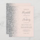 The left-hand edge of this elegant modern wedding invitation features a silver faux glitter border. The customizable text combines gray handwriting, copperplate and italic fonts on a blush pink background. The reverse side features a matching blush and silver design.