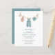 Oh so sweet baby clothes hang on a clothesline in this boho baby shower invitation. Features knit overalls, shoes and cute little bear. This charming invite has script typography with the words oh baby in muted blue as well as script for the mama's name. See coordinating items in our shop. **PLEASE READ BEFORE PURCHASING** Budget stationery measures 4.5 x 5.6 and fits inside an A6 envelope. It does not come with envelopes, but you can add white envelopes to your order. Each sheet is one item - no cutting is required. The default cardstock is bright white with a semi-gloss finish and 110lbs weight which is suitable for stationery. Please note: if you swich to the satin paper option it is a thinner 80lb paper, which is more like magazine pages than cardstock. Use Live Design Service if you need help with your design after making changes or if the design no longer looks right or is cropped. You can upgrade your order to a larger size, higher quality paper and envelopes by clicking transfer and choosing 5 X 7 flat card or click on our store link Enchanted Finch for other paper options. Your order goes directly to the printers. What you see on the screen is what will be printed and shipped to you. Please triple-check spelling and all details before placing your order to ensure accuracy.