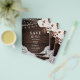 Budget Boho chic wedding save the date postcard features neutral flowers with dried palm leaves and string lights on wood decorated.