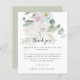 Boho Tinted Florals Eucalyptus Wedding Thank You. A budget friendly SMALLER 4.5” x 5.6” alternative. Available in a SEMI GLOSS 110 lb CARD STOCK or a SATIN FINISH 80 lb THINNER PAPER STOCK. Envelopes are an optional extra. Easily personalise the text to your own details. A coordinating sage green background is on the back.