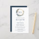 This boho wedding design features the bride and groom's monogram initials framed by a watercolor wreath that includes an indigo blue crescent moon, pampas grass, white flowers, and a gold faux foil circle. Personalize the dark blue text with the couple's names and wedding details. The reverse side is a solid shade of dark blue.