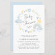 Cute Budget-friendly whimsical boho baby boy shower invitation featuring pastel blue and yellow watercolors of a rainbow, sun, hearts, stars, moons and clouds.
