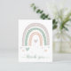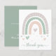 A budget-friendly boho-inspired modern thank you card for any occasion featuring an abstract muted watercolor of a sage green, orange and lavender rainbow with hearts and "thank you" written in a stylish sage green script underneath. On the reverse side, you can personalize a thank you message and add your signature, all in white text against a sage green background.