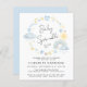 Budget-friendly whimsical boho baby boy sprinkle invitation featuring pastel blue and yellow watercolors of a rainbow, sun, hearts, stars, moons and clouds.