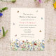 This is a boho and budget friendly bridal shower invitation. The design features a colorful and delicate field of summery wildflower florals in pretty shades of blue, terracotta, pink, purple and yellow. The butterflies and bees add the finishing whimsical and pretty touch.