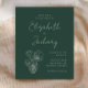 This modern wedding invitation features cream-colored text on a dark green background. A line art floral design appears in the lower left corner. Add the names of the bride and groom in stylish cream handwriting script and the details in sans serif font.