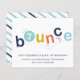 This bounce birthday party invitation features bouncing letters in navy blue, aqua, yellow and orange with the editable age in the O.