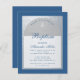 A baptism invitation recommended for a boy. On a classic blue rectangular background, it has a faux silver foil arch that has inside blue text on white background. The word Baptism and the name are written in an elegant calligraphic script; the first line is arched text.