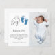 This budget Boy's Baby Shower Thank You Card is decorated with elegant script typography and cute blue glitter baby's feet.