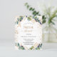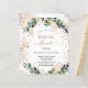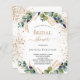 A white background decorated with eucalyptus greenery and golden leaves and faux gold glitter dust. Personalize and the bride to be's name and party details. Black and golden colored letters.