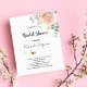 An invitation for a bride to bee. A chic white background. Decorated with a rose gold, blush pink watercolored floral flower (rose) eucalyptus greenery, leaves and sprigs, and a cute happy smiling bumble bee. Personalize and add a name and party details. Black letters. The text: Bridal Shower and the name of the bride to bee are written with a modern hand lettered style script.