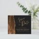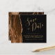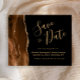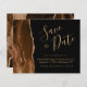 This elegant budget save the date card features a mocha brown watercolor agate border trimmed with faux gold glitter. The customizable text combines gold-colored handwriting script, copperplate and italic fonts on a black background. The reverse side features a matching brown and gold agate design.