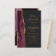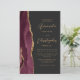 The left-hand edge of this elegant modern wedding invitation features a burgundy red watercolor agate border trimmed with faux gold glitter. The customizable text combines gold-colored script and sans serif fonts on a slate black background. A matching burgundy agate design appears on the back of the card.