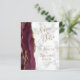 The left-hand edge of this elegant modern wedding invitation features a burgundy watercolor agate border trimmed with faux gold glitter. The customizable text combines gold colored handwriting script with copperplate and italic fonts on a gray and white marble background. The reverse side features a matching burgundy and gold agate design.