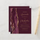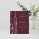 The left-hand edge of this elegant modern wedding invitation features a burgundy red watercolor agate border trimmed with faux gold glitter. The customizable text combines gold-colored script and sans serif fonts on a burgundy background. The reverse side provides space for wedding details on a solid burgundy background, along with a QR code guests can scan to visit your website and RSVP, which saves the cost of printing and mailing separate RSVP cards.