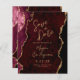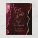 This elegant wedding save the date card features a background image of burgundy red watercolor agate trimmed with faux gold glitter. The customizable text combines gold-colored modern handwriting, copperplate and italic fonts. The reverse side features a coordinating burgundy and gold agate design.