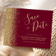 This elegant budget save the date card features a border of gold faux glitter along the left edge. The customizable text combines gold-colored whimsical handwriting script, copperplate and italic fonts on a burgundy red background. The reverse side features a matching burgundy and gold glitter design. NOTE: Envelopes are not automatically included with these budget invitations, so please remember to choose the "blank white envelopes" option!