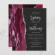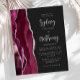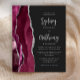 The left-hand edge of this elegant modern wedding invitation features a burgundy watercolor agate border trimmed with silver faux glitter. The customizable text combines silver gray calligraphy script and sans serif font on an off-black background. The reverse side features a matching burgundy and silver agate design.