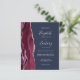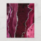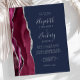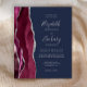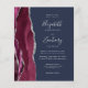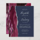 The left-hand edge of this elegant modern wedding invitation features a burgundy watercolor agate border trimmed with silver faux glitter. The customizable text combines silver gray handwriting, copperplate and italic fonts on a navy blue background. The reverse side features a matching burgundy and silver agate design.