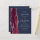 The left-hand edge of this elegant modern wedding invitation features a burgundy red watercolor agate border trimmed with faux silver glitter. The customizable text combines silver gray script and sans serif fonts on a navy blue background. The reverse side provides space for wedding details on a solid navy blue background, along with a QR code guests can scan to visit your website and RSVP, which saves the cost of printing and mailing separate RSVP cards.