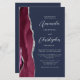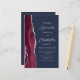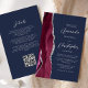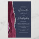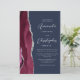 The left-hand edge of this elegant modern wedding invitation features a burgundy red watercolor agate border trimmed with faux silver glitter. The customizable text combines silver gray script and sans serif fonts on a navy blue background. The reverse side provides space for wedding details on a solid navy blue background, along with a QR code guests can scan to visit your website and RSVP, which saves the cost of printing and mailing separate RSVP cards.