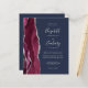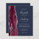 The left-hand edge of this elegant modern wedding invitation features a burgundy watercolor agate border trimmed with silver faux glitter. The customizable text combines silver gray handwriting, copperplate and italic fonts on a navy blue background. Add additional details on the back, along with a QR code to help your guests visit your wedding website.