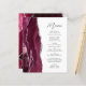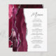 The left-hand edge of this elegant modern wedding menu features a burgundy watercolor agate design trimmed with faux silver glitter. The customizable text combines charcoal gray handwriting script and sans serif fonts on a white background. The burgundy and silver agate design is repeated on the reverse side.