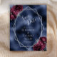 This elegant modern wedding save the date card features a silver geometric frame decorated with burgundy and silver floral bouquets on a navy blue faux foil background. The customizable text combines silver gray whimsical handwriting, copperplate and italic fonts.