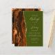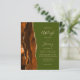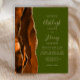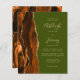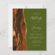 The left-hand edge of this elegant modern wedding invitation features a burnt orange and brown watercolor agate border trimmed with faux gold glitter. The customizable text combines tan handwriting, copperplate and italic fonts on an olive green background. The reverse side features a matching agate design.