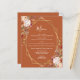 This elegant modern wedding menu features a gold geometric frame decorated with watercolor floral bouquets in autumn colors of burnt orange, peach, burgundy and blush on a burnt orange background. The customizable text combines white whimsical handwriting and copperplate fonts. The reverse side is solid burnt orange.