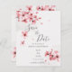 A modern elegant floral wedding save the date card featuring blush pink watercolor cherry blossoms and modern calligraphy on a handmade paper texture.