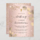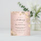 A blush, rose gold background decorated with eucalyptus greenery and faux glitter dust. Personalize and a name and ceremony details. Black colored letters.