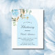 A white background decorated with eucalyptus greenery, a light blue rose, and golden leaves and a blue arch frame. Personalize and the childs name and ceremony details. Elegant hand lettered style script.