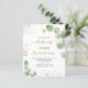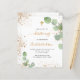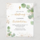 A white background decorated with eucalyptus greenery and faux gold glitter dust. Personalize and the childs name and ceremony details. Black and golden colored letters. Gender neutral.