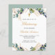 A white background decorated with eucalyptus greenery and golden leaves. Personalize and the child's name and ceremony details. Black and golden colored letters.