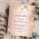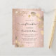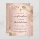 A blush, rose gold background decorated with eucalyptus greenery and faux glitter dust. Personalize and a name and ceremony details. Black colored letters.