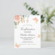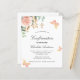 A white background decorated with eucalyptus greenery, a rose gold and blush pink rose, golden leaves and butterflies. Personalize and a name and ceremony details.