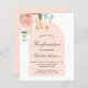 A white background decorated with eucalyptus greenery, a rose gold and blush pink rose, and golden leaves and a rose gold arch frame. Personalize and a name and ceremony details. Hand lettered style script.