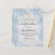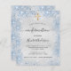 Faux silver metallic looking background decorated with blue faux glitter dust and a golden cross. Personalize and add a name and party details. Black colored letters.
