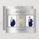 Add 3 of Your birthday photos, vertical size, a date, name, and the thank you note. A classic navy blue background with white text and frame. The text: Thank you on the front and your name on the back are written with a stylish hand lettered script with swashes.