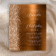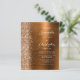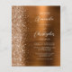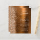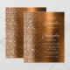 This elegant modern wedding design features customizable text combining white handwriting, copperplate and italic fonts on a copper faux brushed metal background with a faux glitter left-hand border. The reverse side features a matching glitter and brushed metal design.