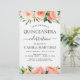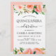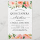 Budget Coral, Peach and white Floral and Eucalyptus Greenery Botanical Spring or Summer Pastel Quinceañera 15th Birthday Party Celebration Invitations - includes beautiful and elegant script typography with modern botanical flowers and greenery for the special Quinceañera celebration.