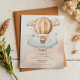 The design of this first birthday invitation features a soft and whimsical theme. At the center is an illustration of a tiger cub sitting in a small woven basket attached to a pastel orange and cream-striped hot air balloon. The balloon floats among fluffy watercolor-style clouds, creating a dreamy, sky-inspired background. The color palette is soft and calming, with shades of peach, light blue, and white dominating the scene. The text is placed below the illustration, with playful and elegant fonts complementing the theme. The overall layout exudes a cheerful and gentle tone, perfect for a child’s celebration.