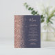 The left-hand edge of this elegant modern wedding menu features a rose gold faux glitter border. The customizable text combines rose pink whimsical handwriting script and copperplate fonts on a dark blue background. The reverse side features a matching dark blue and rose gold glitter design.