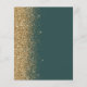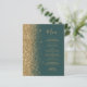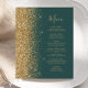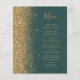 The left-hand edge of this elegant modern wedding menu features a gold faux glitter border. The customizable text combines gold-colored whimsical handwriting script and copperplate fonts on a dark green background. The reverse side features a matching dark green and gold glitter design.