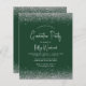 This simple, elegant graduation party invitation features a top and bottom border of silver faux glitter on a dark green background. The word "Graduation" and the name of the graduate appear in decorative modern handwriting font. Customize the invitation with party details in white sans serif font on a dark green background. A matching dark green and silver glitter design appears on the reverse side.